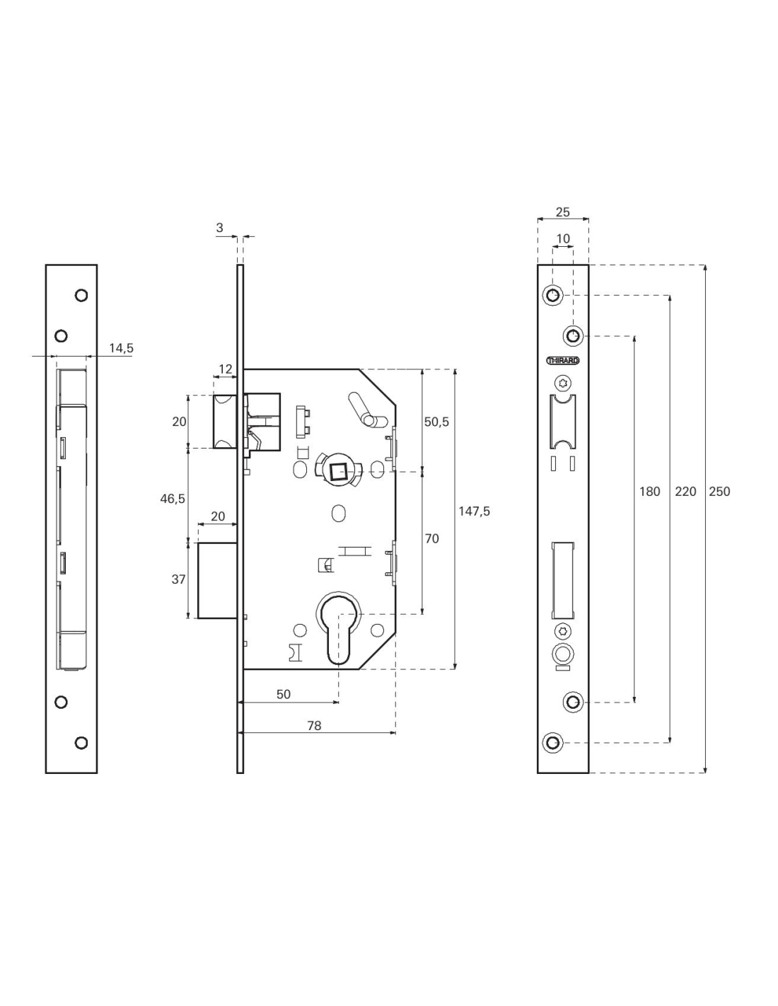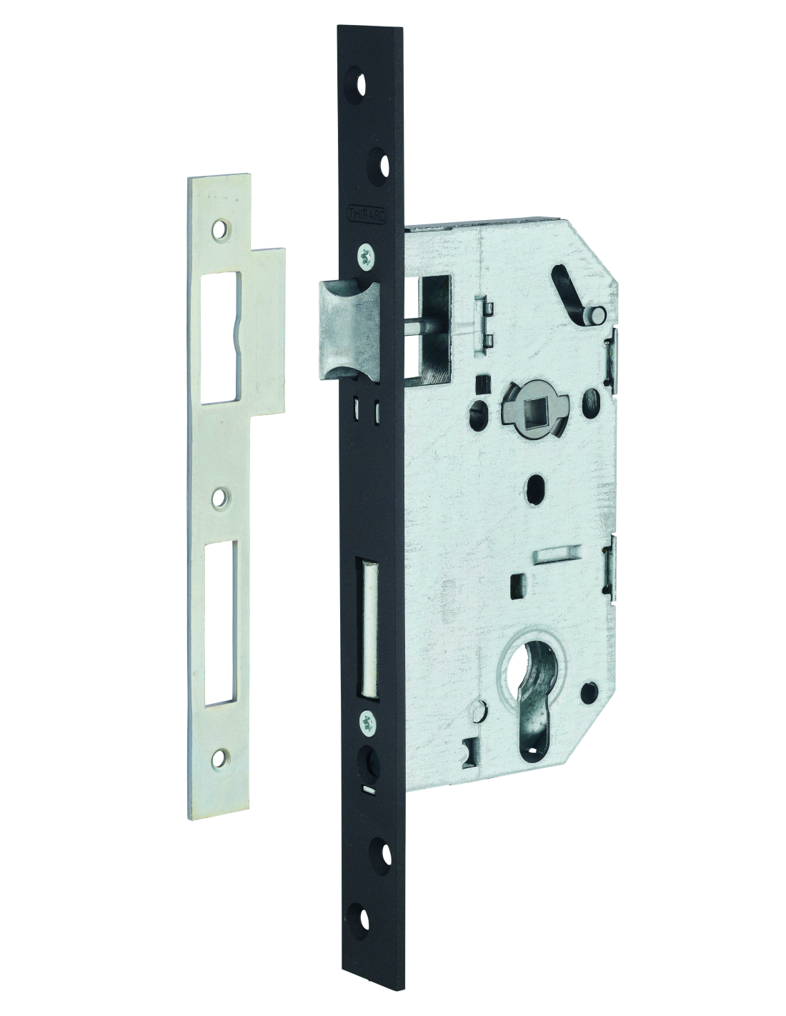 Description :Coffre acier embouti. Têtière acier noire bouts carrés. Demi-tour bipente alliage réversible sans démontage du coffre. Pêne acier galvanisé. Gâche plate acier zingué. Mécanisme 2 tours. Rappel du demi-tour par la clé. Carré de 7mm, entr’axe 70mm.