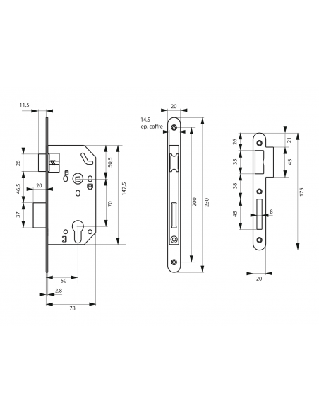 DescriptionCoffre acier embouti galvanisé. Têtière acier bouts ronds. Demi-tour bipente laiton réversible sans démontage du coffre. Pêne acier zingué - Gâche plate acier zingué. Mécanisme à 2 tours - Rappel du 1/2 tour par la clé. Carré 7 mm, entr’axe 70 mm.FinitionCoffre galvanisé, têtière noir granitéVersionTêtière laitonné. Têtière nickelé. Têtière inox. Possibilité 8 mm sur demande.