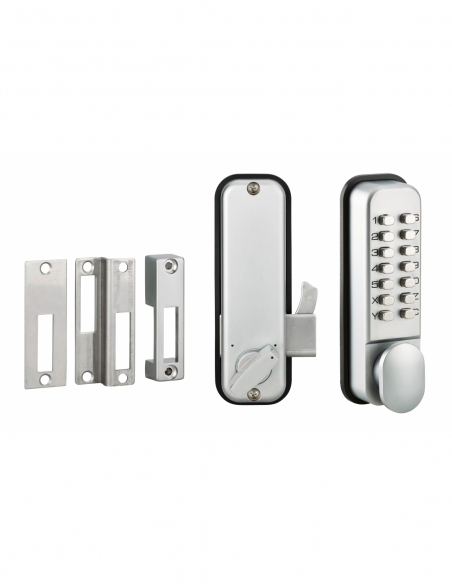 DescriptionCoffre en alliage moulé. Mécanisme à combinaison modifiable de 2 à 8 chiffres ou lettres. 8 000 combinaisons possibles. Modification de la combinaison rapide. Réversible droite / gauche. Pour porte épaisseur 32 à 55 mm maxi. FinitionChromé matVersionVerrou avec pêne demi-tour à encastrer. Avec pêne à crochet pour porte coulissanteUtilisationPorte d’intérieur