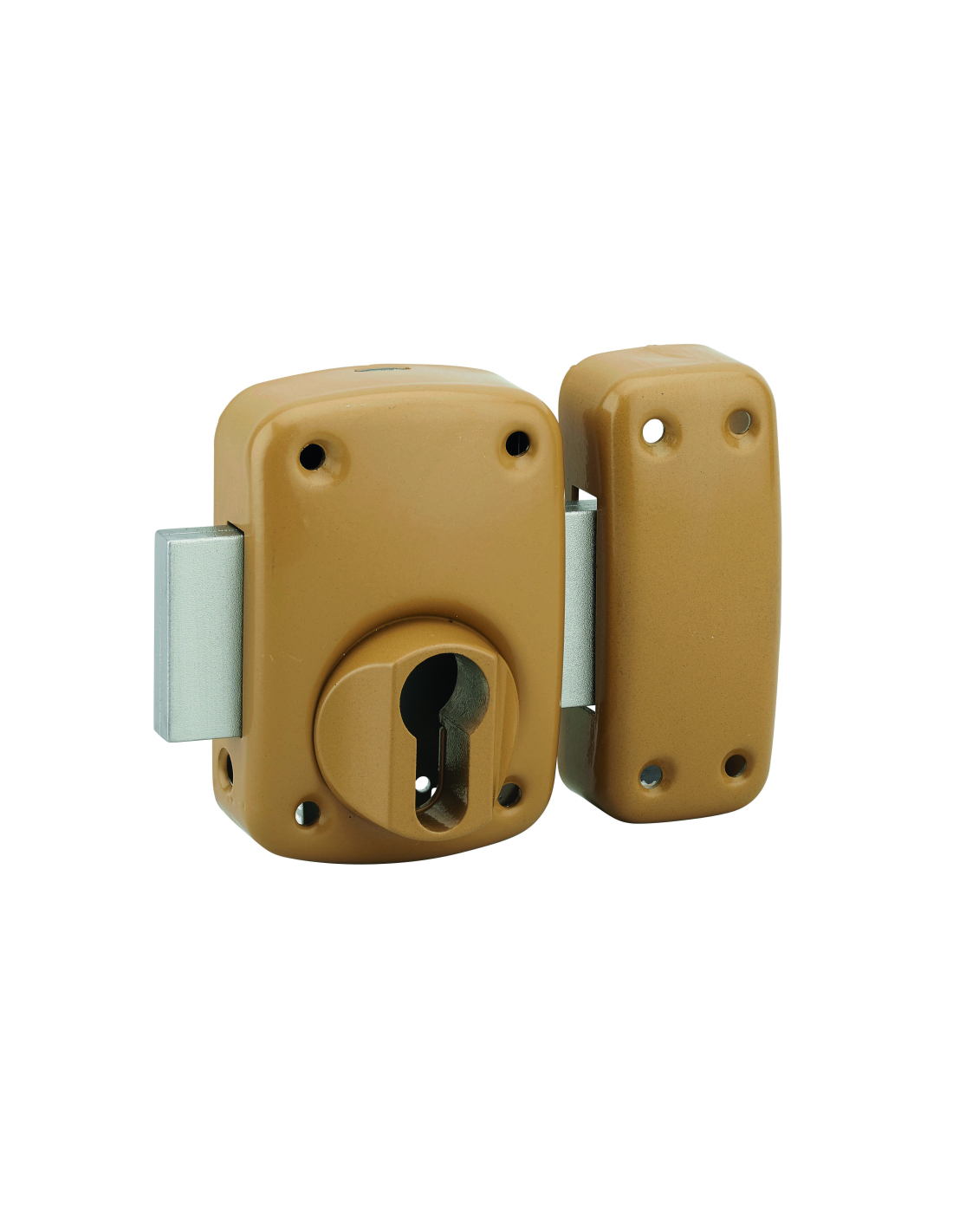 Description :Coffre et gâche acier embouti. Pêne acier nickelé.